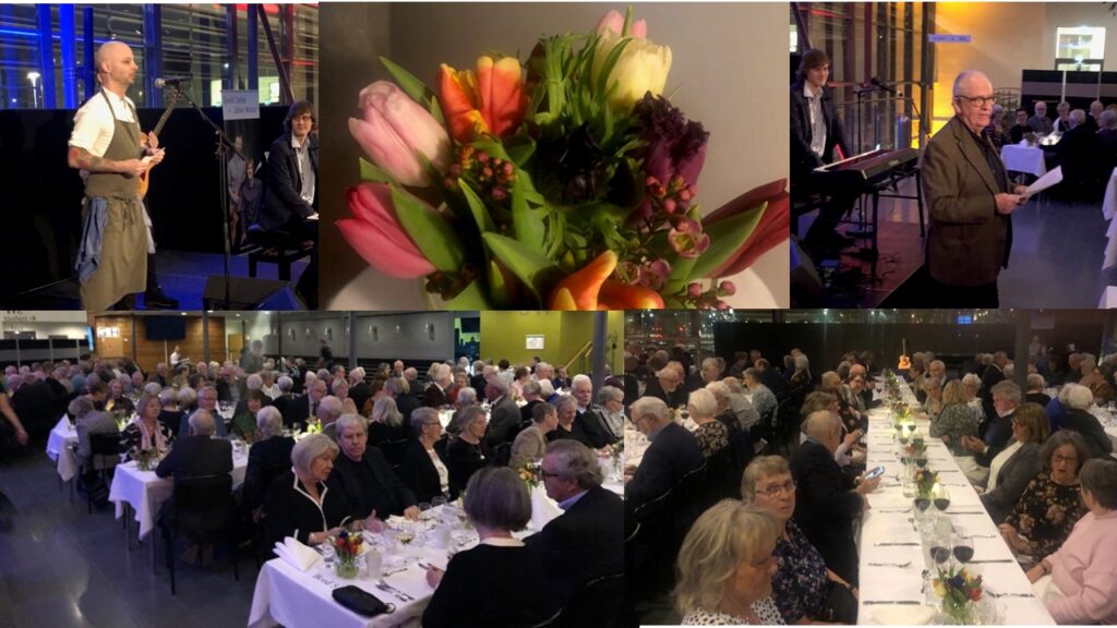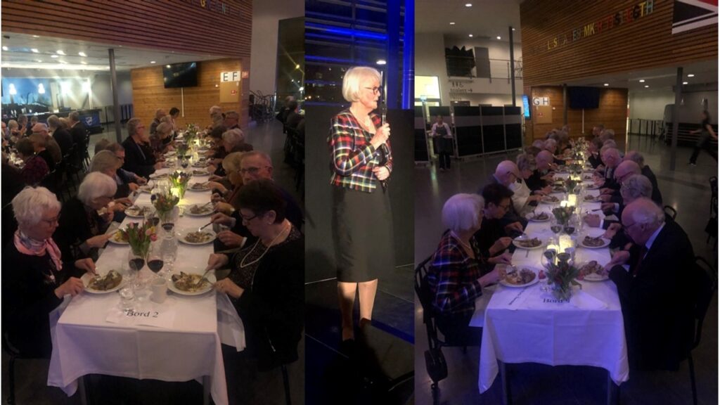 Föreningens ordförande Roger Edvinsson hälsade välkommen och utbringade en välkomstskål. Kvällens kock från Mattias Mat presenterade menyn som bestod av toast Skagen, grillad örtmarinerad fläskfilé och päron brulé tillsammans med goda drycker. Borden var dukade i vitt och dekorerade med vårblommor i vackra färger.