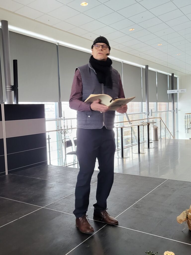 ”Det är inte bara gamla tanter som broderar” var rubriken för dagens föreläsning av Krister Persson från Borås. Han tog oss med på en spännande resa från att som en 12-årig grabb från Rosengård med ett brinnande intresse för skapande skrev berättelser, spelade in musik och broderade tavlor.